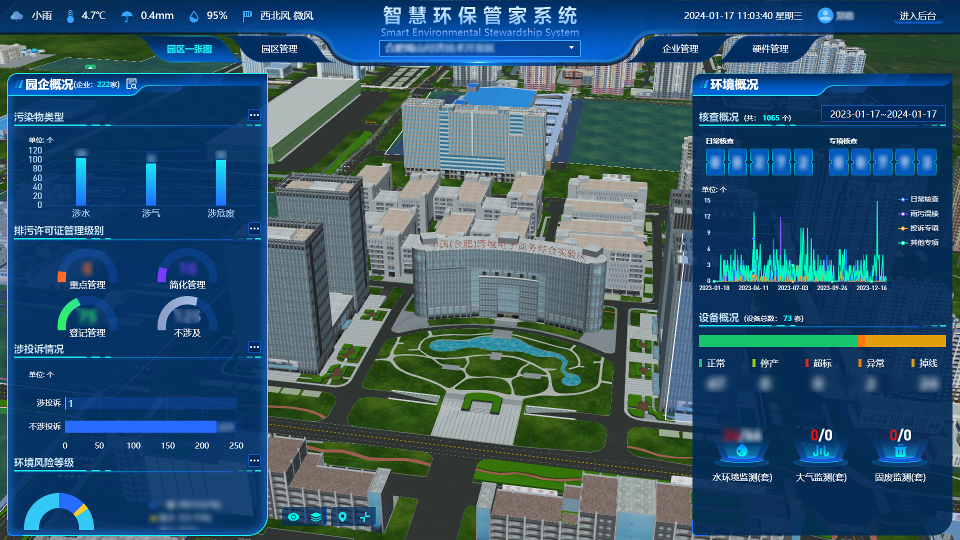 此业务板块包括:结合《安徽省“十四五”生态环境保护规划》、《安徽省“十四五”生态环境保护规划》,推动建立面向中小企业线上线下环保综合服务平台、构建智慧高效的生态环境管理信息化体系。 现自主研发产品包括智慧园区平台、工业污水处理数字化监管平台、数字孪生流域防洪系统、小微企业危险废物管理平台等。